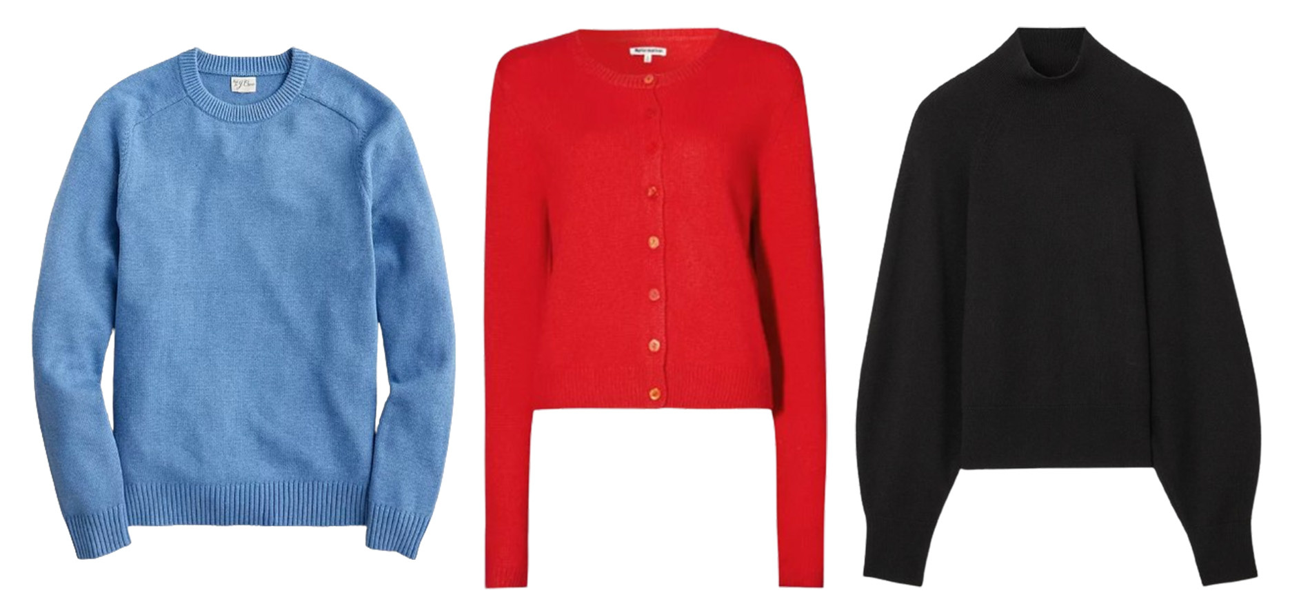 I rotated through 3 sweaters. Reformation’s Clara cardigan, a men’s pullover from J.Crew, and a shapely wool piece from COS (similar here). For me, they accomplish different things. The cardigan is sweeter and more coquette, better for going out to dinner or drinks. The pullover is casual for daytime, and doubles as a scarf when draped across my shoulders, and the COS sweater, because it has some built-in shape, feels more put-together and chic, even on an airplane.